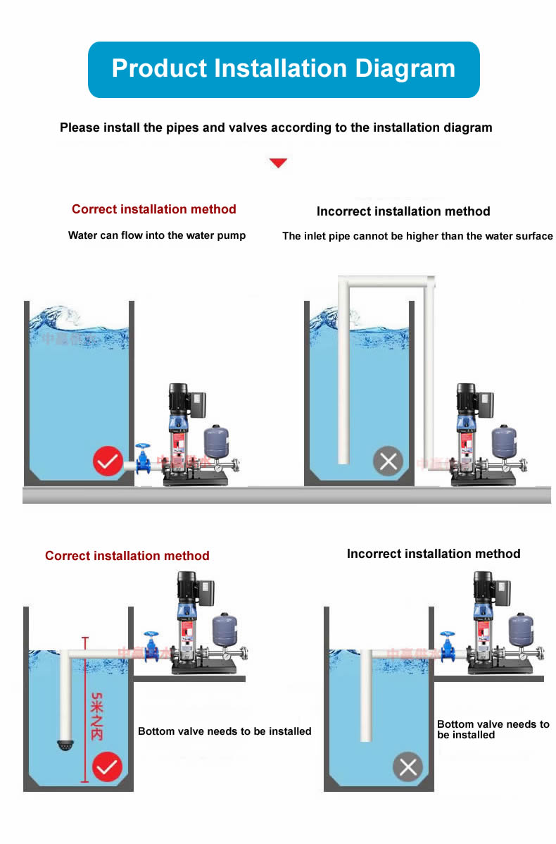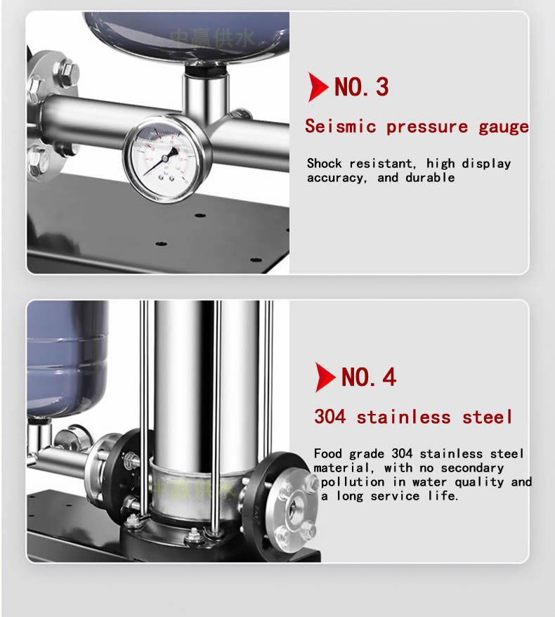 The fully automatic variable frequency constant pressure water supply pump is a type of fully automatic booster pump that is directly connected in series on the pipeline or installed on the edge of the water tank. It can automatically work and stop according to the water usage situation, and has a series of advantages such as stable pressure, cleanliness, hygiene, small size, low noise, energy saving, environmental protection, adjustable parameters, and simple use. It is an ideal water supply pump for boosting household tap water, villas, small hotels, farmhouses, small-scale water supply projects, and other areas.